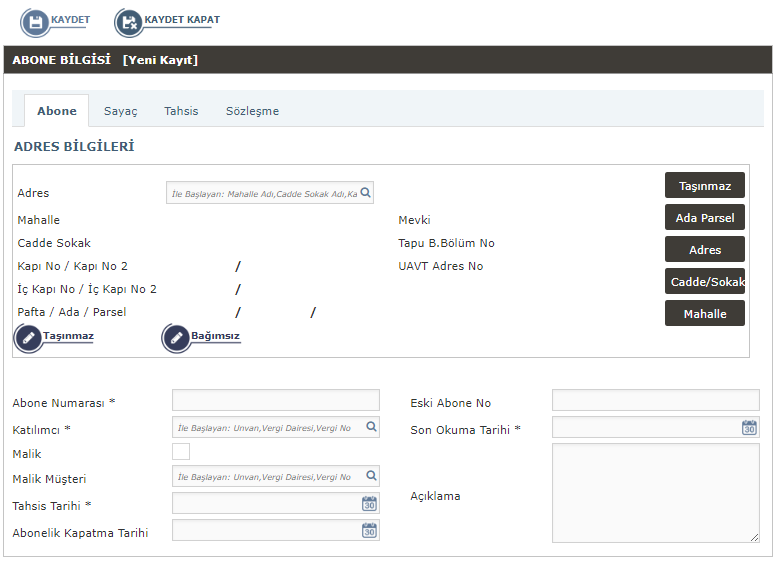 Abone kayıt işlemleri, katılımcı firma sicil numarasını otomatik oluşturma, mülkiyet ve tahsis durumu, adres vb. detay bilgilerini girip listeleyin.