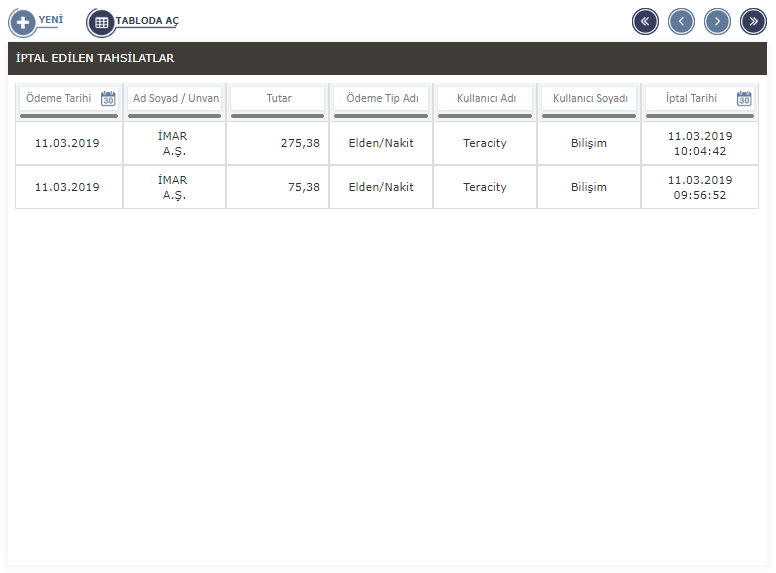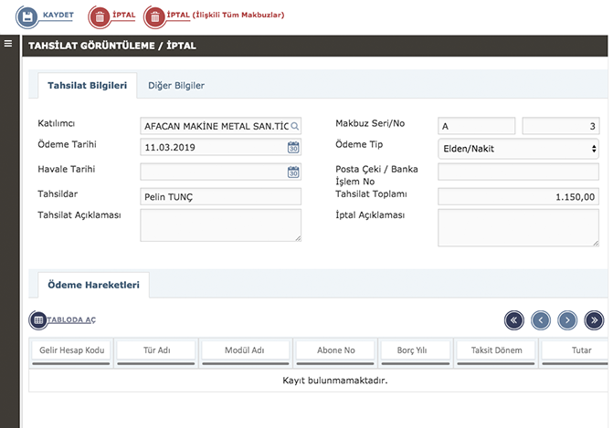 Tahsilatları görüntüleyebilir ve tahsilat iptalini gerçekleştirebilirsiniz.