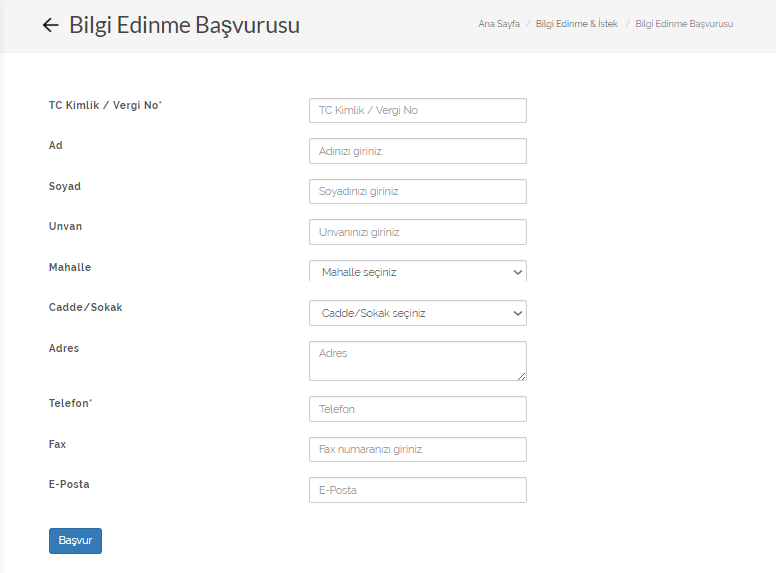 İletişim bilgilerinizi girerek istediğiniz bilgi ve belgeleri belirterek bilgi edinme başvurusunda bulunabilirsiniz. Başvurunuza e-posta ve resmi yazı ile geri bildirim yapılmasını isteyebilirsiniz.