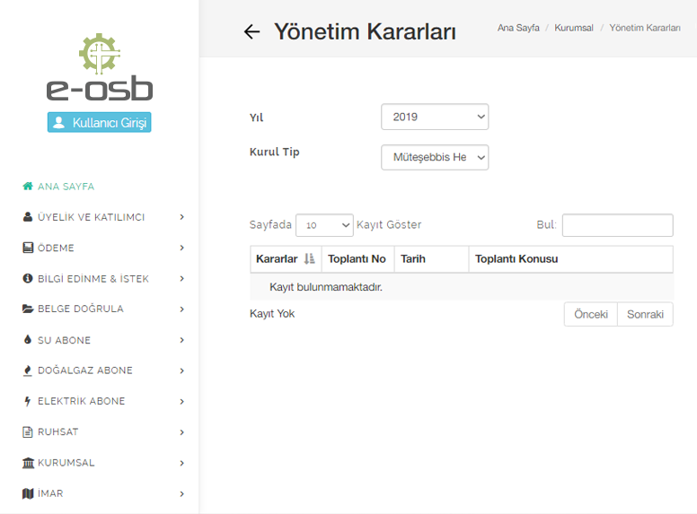 Yönetim kurulu kararlarını, karar no, yıl ve ay olarak sorgulayarak listeleyebilir ve alınan kararları görebilirsiniz.