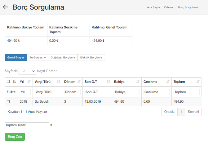 İstenildiği taktirde geçmiş dönem ödemelerini Katılımcı no, TC Kimlik ya da Vergi No girerek listeleyebilirsiniz.