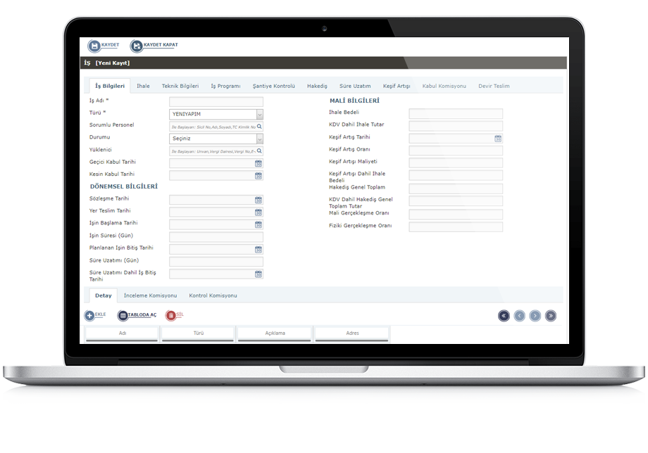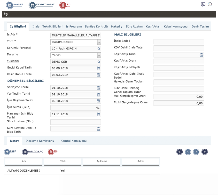 İşin detayını, iş hacmini ve mali bilgileri kayıt altına alabilirsiniz.