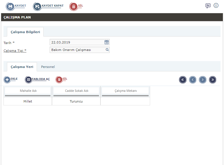 Çalışma türlerini (yıkım, bakım, onarım, parke döşeme, asfalt yama vb.) tanımlayabilir ve bu işlerle ilgili mahalle, cadde, sokak ve mekan bazında çalışma planı yapabilirsiniz.