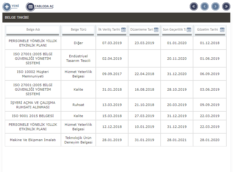 Mevcut kalite belgelerinin geçerlilik durumunu, bitiş tarihini, denetim tarihlerini vb. kayıt altına alabilir, belgenin sona erme tarihinden önce hatırlatma uyarısı yapmasını sağlayın.