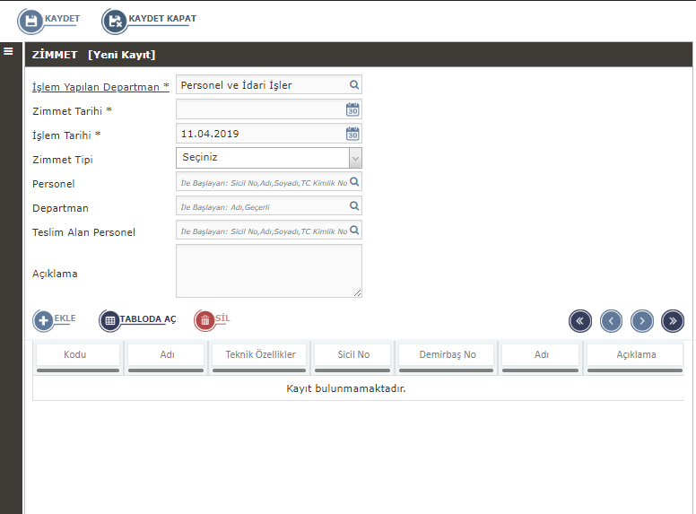 Bütün yapılan zimmetleri işlem tarihi, personel, zimmet tipi vb. türünde listeleyebilir, tablo aracına alabilir ve üzerinde işlem yapın.