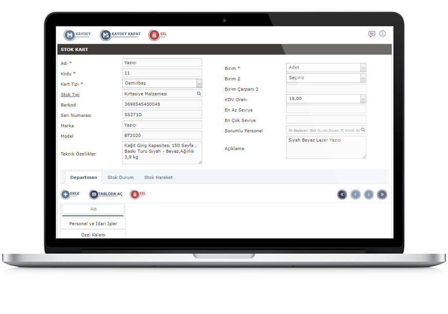 Stok adı, kodu, seri no, marka, model, KDV durumu vb. detaylı tanımlayabilir ve stok kartı, stok tip ve alt tip niteliğine göre sınıflayın.